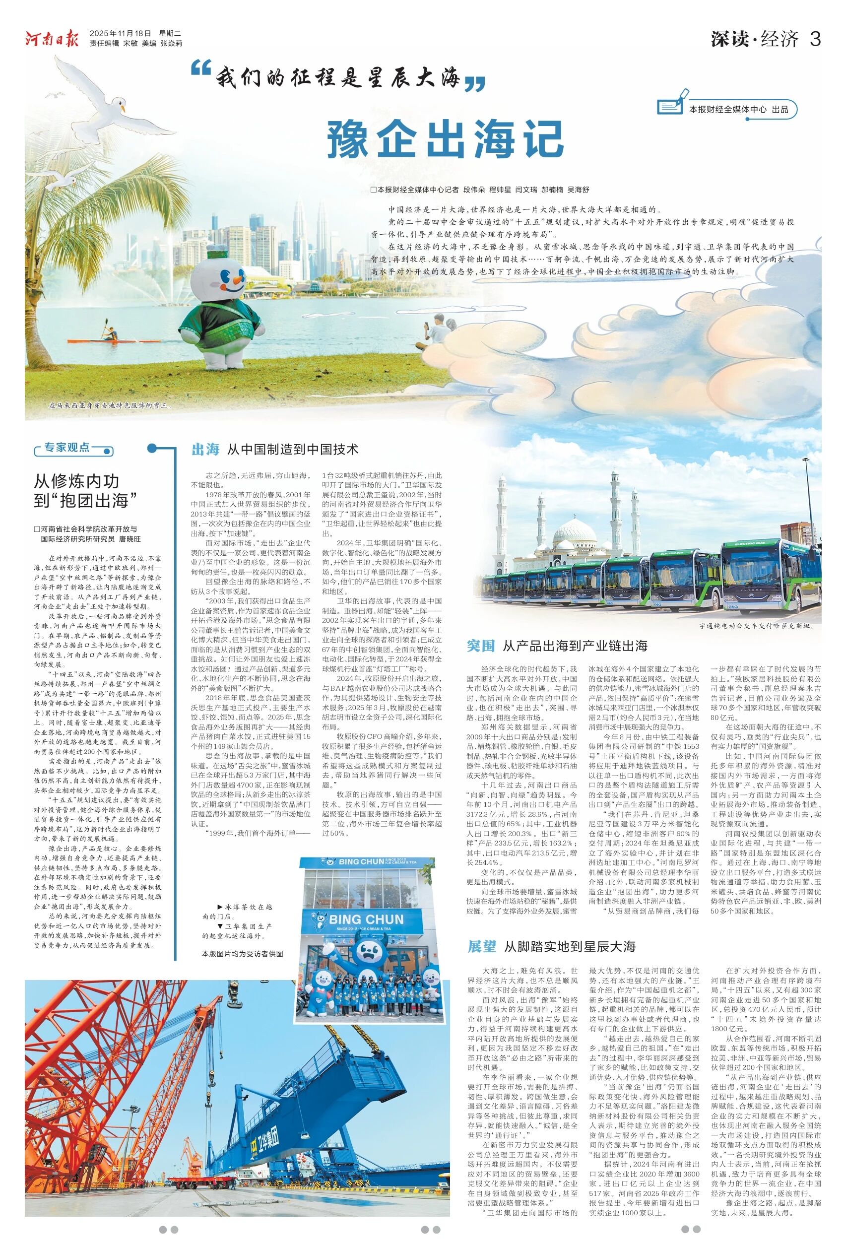 在这片经济的大海中,不乏豫企身影。从蜜雪冰城、思念等承载的中国味道,到宇通、卫华集团等代表的中国智造,再到牧原、超聚变等输出的中国技术……百舸争流、千帆出海、万企竞速的发展态势,展示了新时代河南扩大高水平对外开放的发展态势,也写下了经济全球化进程中,中国企业积极拥抱国际市场的生动注脚。